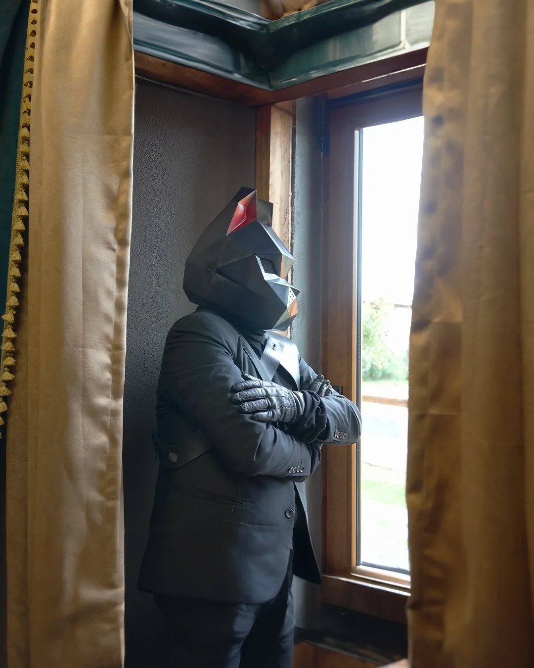 Mask was constructed out of thick stock construction paper. Reinforced with recycled cardboard. Then mesh was added for visibility and to obscure eyes. Topped off with a strong gold lacquer and soft felt lining on the inside for comfort.