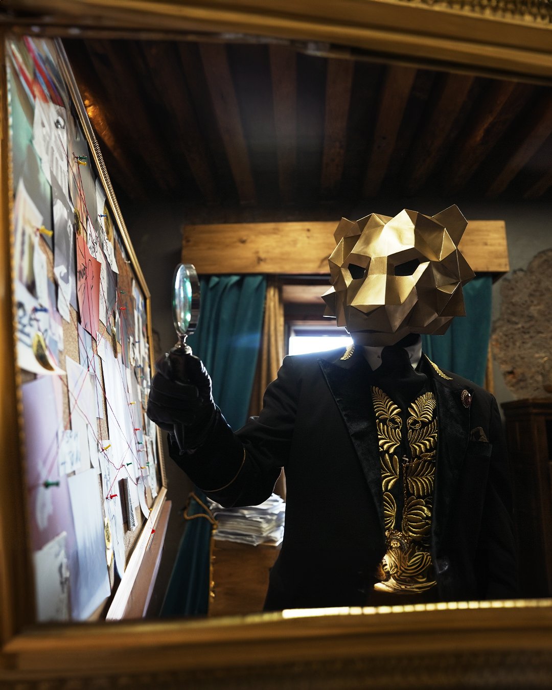 Lion geometric mask as a kaleidoscope + backdrop for the show and overall design